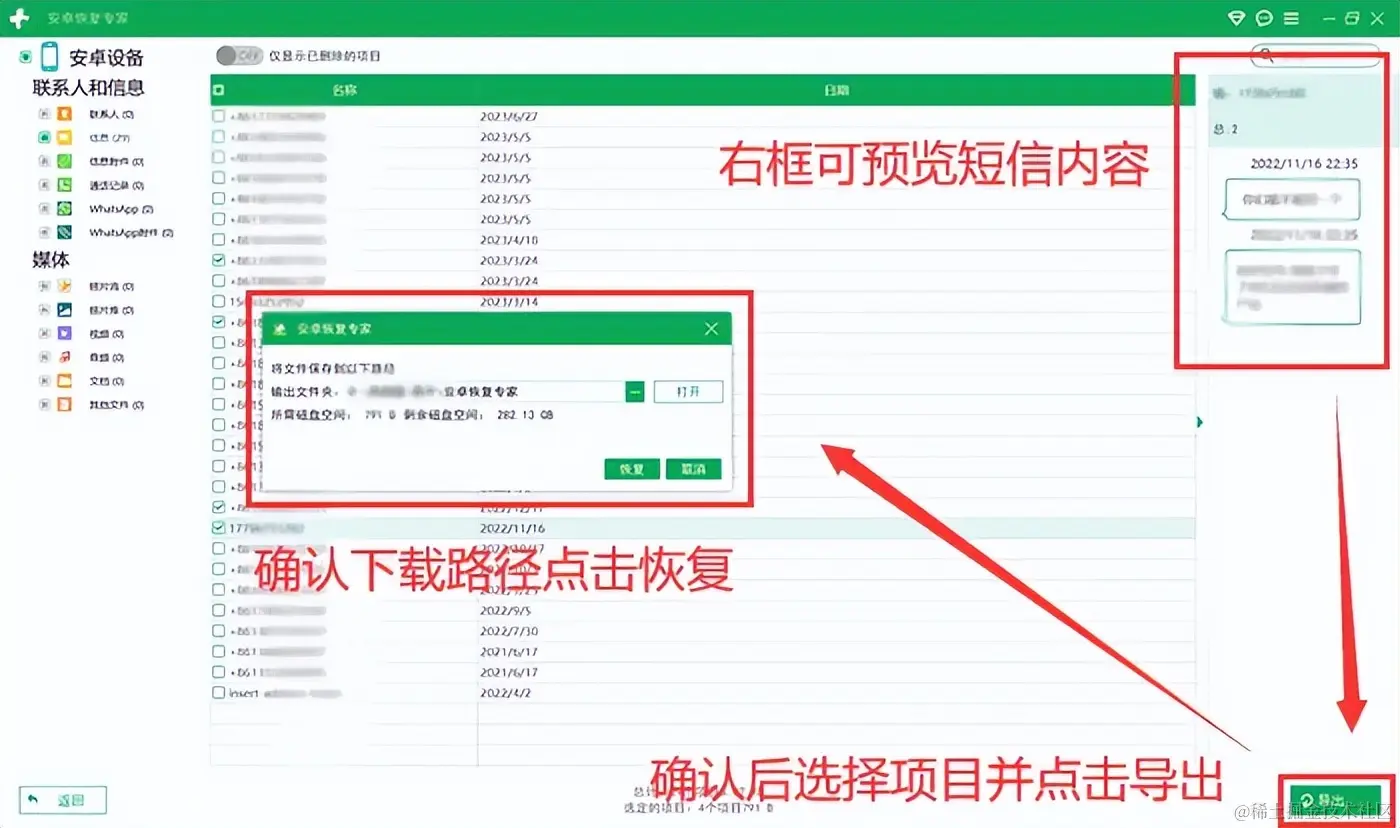 步骤3:选择和导出到电脑。扫描完成后,它将列出所有找到的短信数据,用户可以预览这些短信的内容,然后选择想要恢复的项目,点击 【导出】 ,确认恢复路径后,它将自动把数据下载到文件夹中。