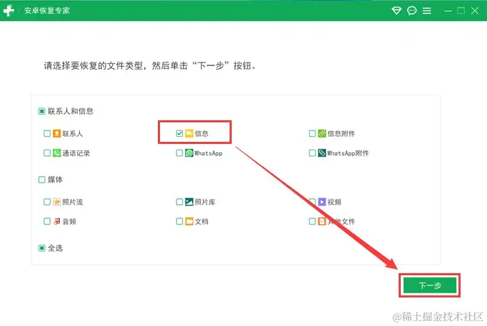 步骤2:扫描手机数据。它还提供了许多恢复选项,让用户能够根据自身需求进行选择,比如我们需要恢复手机短信,就可以单独选中 【信息】 ,然后点击下一步开启扫描,它将开始扫描你的手机存储空间,寻找丢失的短信。