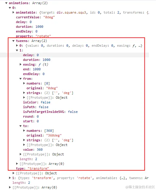 每一项animation包含的属性有animatable、delay、duration、endDelay、property、tweens,animatable为DOM元素,tweens为缓动动画列表。