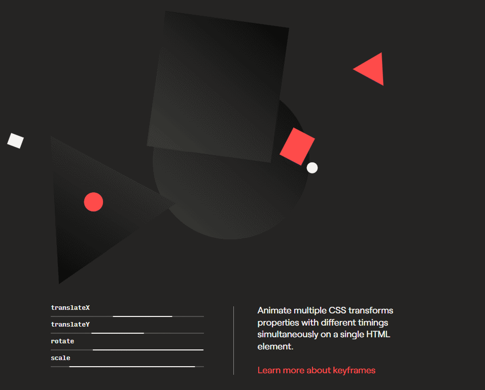keyframes关键帧与 CSS 中的 @keyframes 规则类似,并且可以为每项定义动画持续时间,使用 keyframes 属性能够提供更灵活、复杂的动画效果,允许你在不同的时间点定义不同的样式,从而实现更具创意和变化的动画。