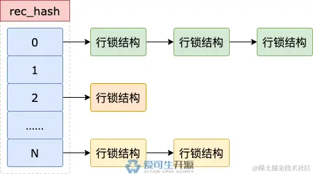 锁模块结构的 rec_hash 属性是个哈希表,分为很多小格子,每个格子管理一个行锁结构链表。