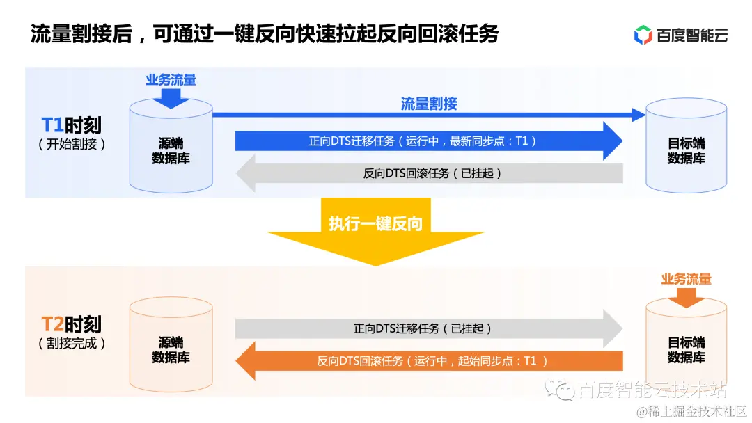 如下图所示,客户在 T1 时刻执行流量割接,此时正向迁移任务运行中,而反向回滚任务处于挂起状态。在 T2 时刻,客户完成割接,此时业务流量已切到目标端数据库,此时执行一键反向,DTS 会将正向迁移任务挂起,反向回滚任务启动,从客户指定的 T1 时刻开始将目标端的业务写入实时同步回源端。从而完成正向迁移到反向回滚的切换。