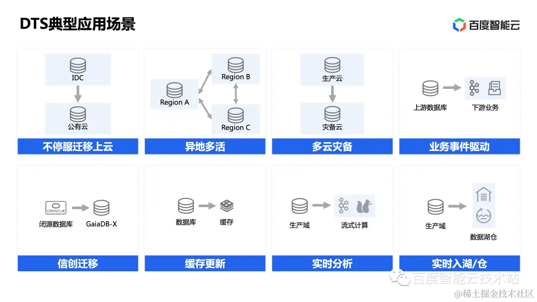 我们对 DTS 的所能支持的各类业务需求归纳为 8 种典型的场景,供大家参考。分别是:不停服迁移上云、异地多活、多云灾备、业务事件驱动、信创迁移、缓存更新、实时分析、实时入湖/仓。