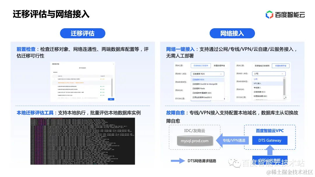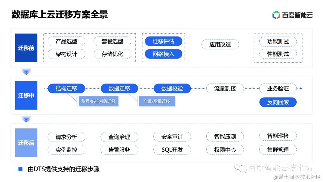 在上云迁移方向,DTS 基于百度多年实践总结出一套成熟的数据库上云迁移方案,围绕该方案提供一站式上云迁移体验。