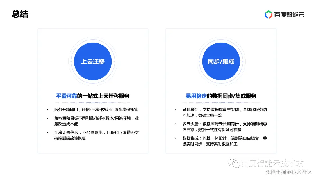 最后,我们对今天的分享做个总结,我们分享了百度智能云在数据库上云迁移和数据同步/集成方向的设计思路和落地实践。