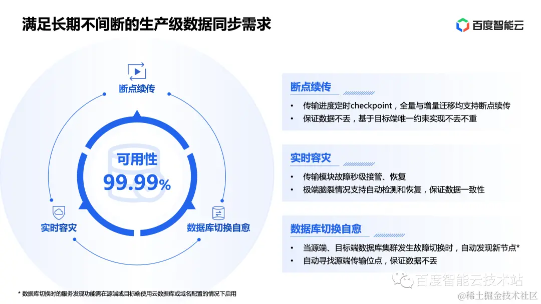 经过百度智能云内外部数据传输场景的长期实践打磨,DTS 承诺的任务可用性为 4 个 9。