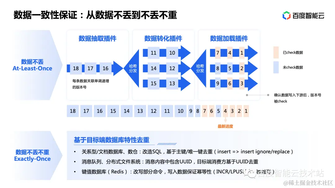 DTS 以数据不丢为基础,进一步实现了数据的不丢不重,以保障数据的一致性。