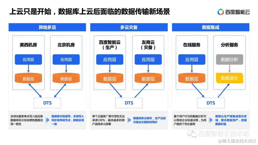 在数据库上云后,我们看到客户在使用数据库时仍然有很多数据传输的新场景,其中有三个典型场景: