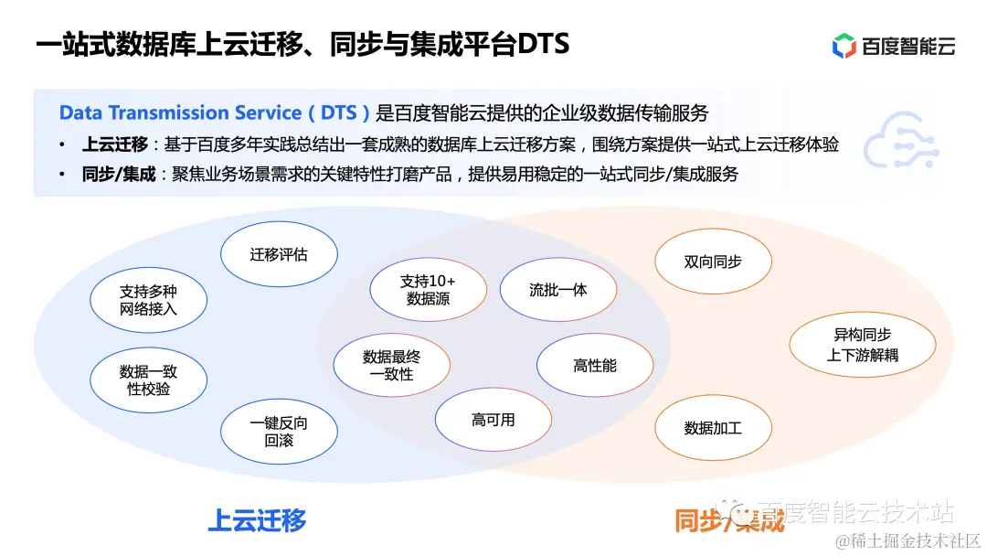 基于上述的客户需求,百度智能云推出了一站式数据库上云迁移、同步与集成平台 DTS。