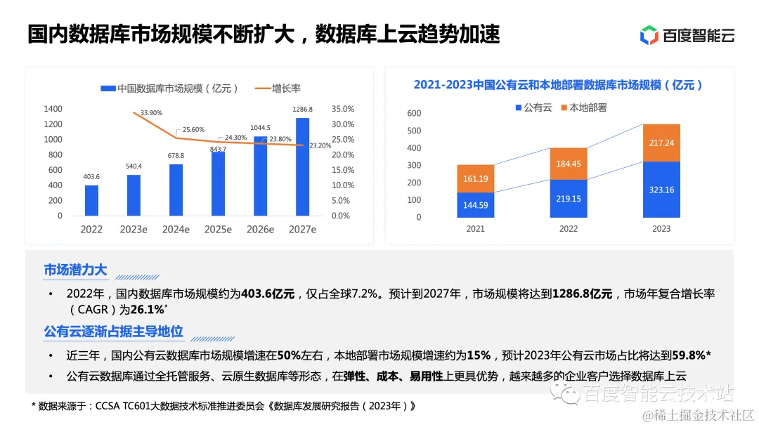 根据大数据技术标准推进委员会今年 7 月发布的《数据库发展研究报告(2023 年)》,我们可以看到,去年国内的数据库市场规模约为 400 亿,今年预计可以达到 540 亿,预计到 2027 年,国内数据库市场规模可达 1280 亿。未来几年复合增长率预期可以达到 26% ,市场潜力非常大。