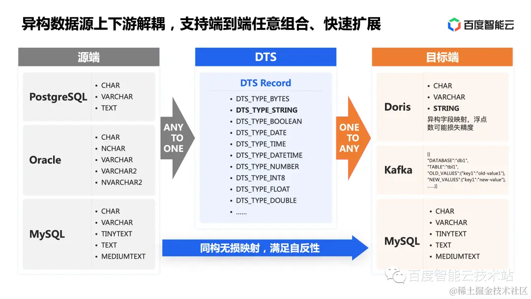 当然,在异构字段映射的过程中,部分数据可能会因为浮点数精度/字符集不同造成数据精度损失。因此,DTS 优化了同构字段映射规则。当上下游数据源同构时,源端数据能够无损映射到目标端。