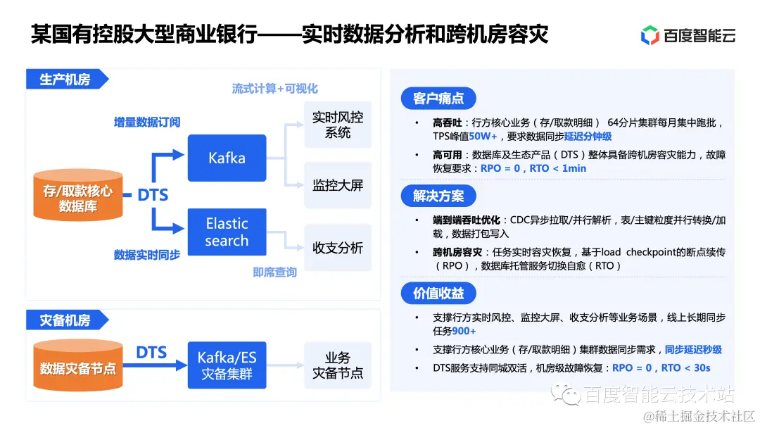 最终,百度智能云帮助该行落地了实时风控、监控大屏、收支分析等业务场景,线上长期同步任务 900+;同时,支撑行方核心业务(存/取款明细)集群数据同步需求,同步延迟秒级。此外,DTS 服务支持同城双活,机房级故障恢复实现了 RPO = 0,RTO < 30s。