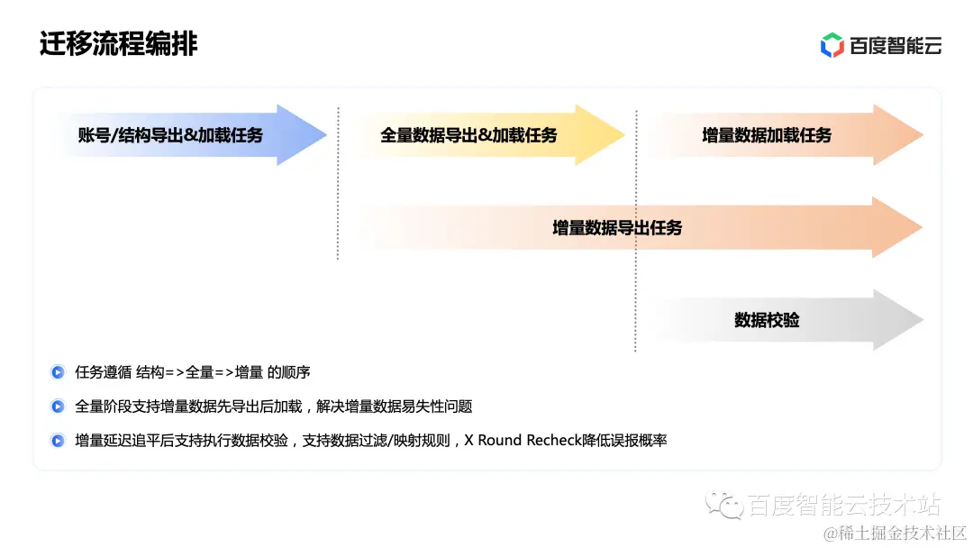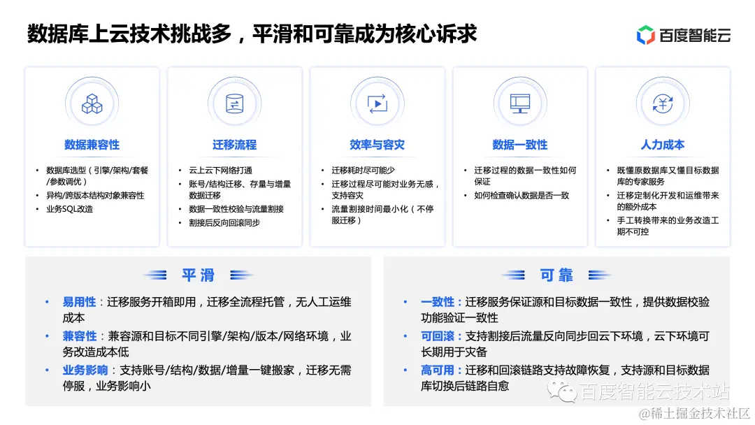 百度智能云在多年的数据库上云迁移实践中积累了丰富的经验。我们认为,在数据库上云迁移中,平滑和可靠是客户的核心诉求,也是对迁移服务的必然要求。