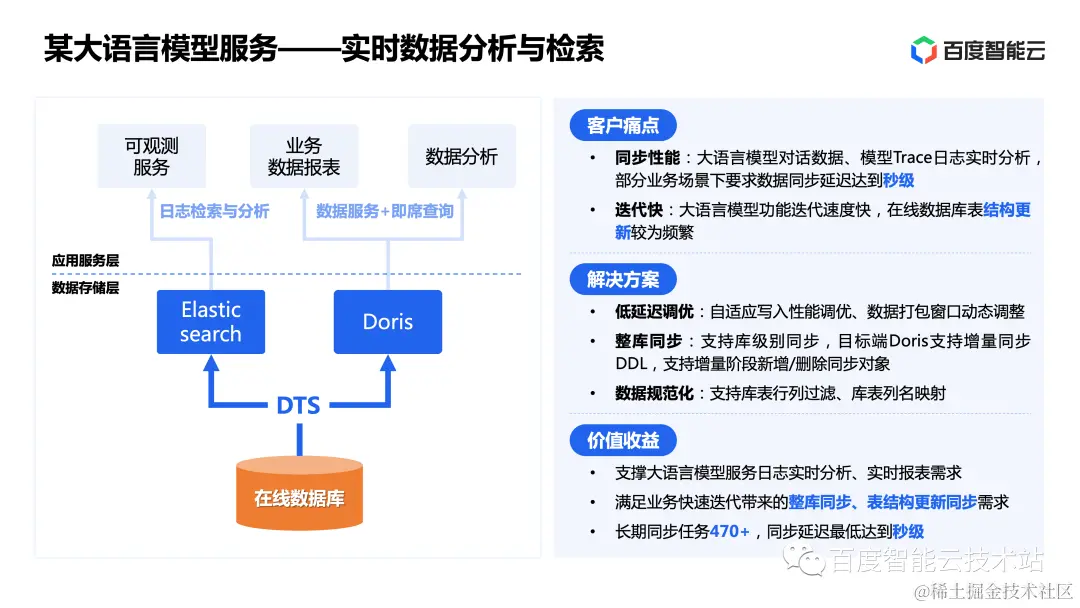 百度智能云支撑了该大语言模型中服务日志实时分析与实时报表的需求,同时也满足了业务快速迭代带来的整库同步、表结构更新同步等需求,最终实现了长期同步任务 470+,同步延迟最低达到秒级的业务效果。