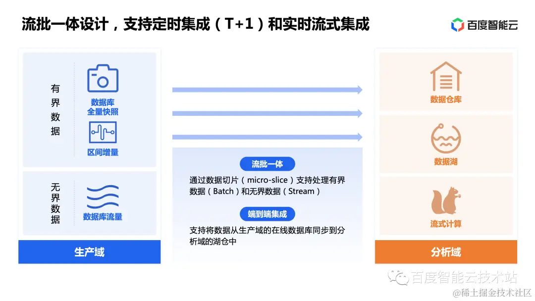 DTS 的架构天然支持流批一体,源端无论是有界数据(数据库快照,指定区间的增量)还是无界数据(持续的数据库流量),都会通过数据切片的方式切分为无数个 Micro-Slice,通过流水线作业最终同步到目标端的仓、湖或流式计算框架。