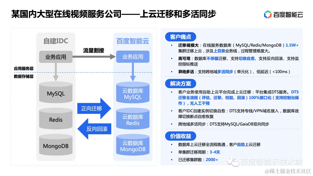 最终,百度智能云帮助该客户跑通了数据库上云迁移的全流程,并支持客户自助上云迁移,目前已经支持 2000+ 集群的迁移,单集群的迁移周期缩短到 3-4 天。