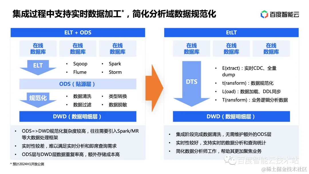 DTS 基于业界最新提出的 EtLT 架构推出了支持实时数据加工的集成方案。它可以将数据从在线域直接集成到 DWD,在集成阶段即可完成实时的数据规范化,无需维护额外的 ODS 层。EtLT 架构的实时性要优于 ELT+ODS 架构,可以支持实时的数据分析和查询统计,让复杂的数据抽取、规范化和加载的过程对数据分析过程透明,帮助其更加聚焦业务。