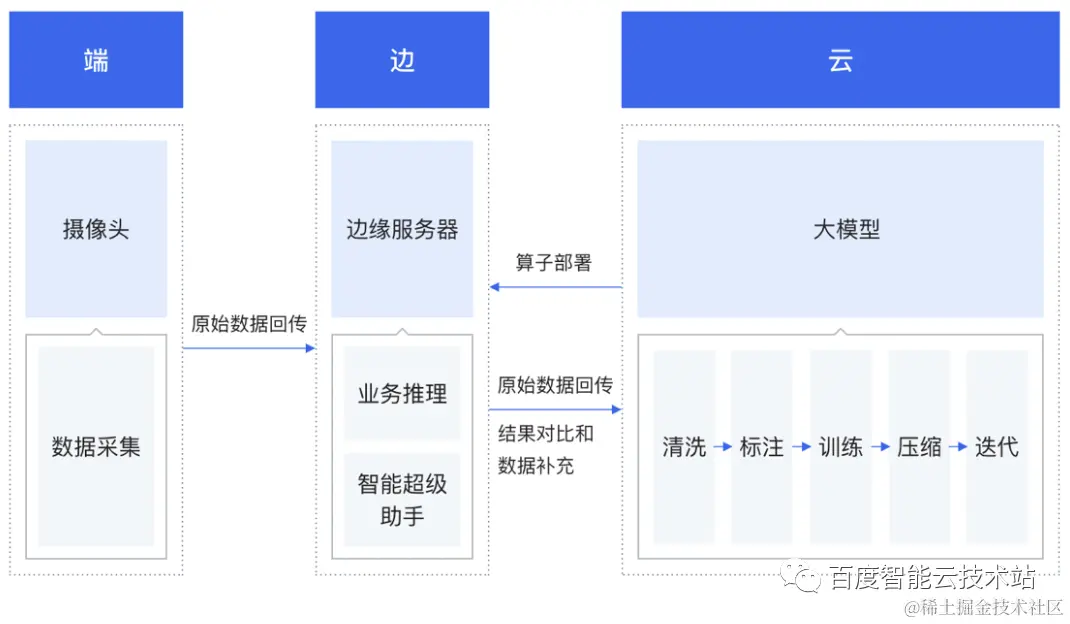 百度智能云边缘计算团队成功地将大模型、业务场景、边缘设备进行融合,使得边缘服务器 ECS上的算子具备了「场景自适应能力」,并实现了「采集 - 清洗 - 标注 - 训练 - 部署 - 迭代」全流程的自动化。