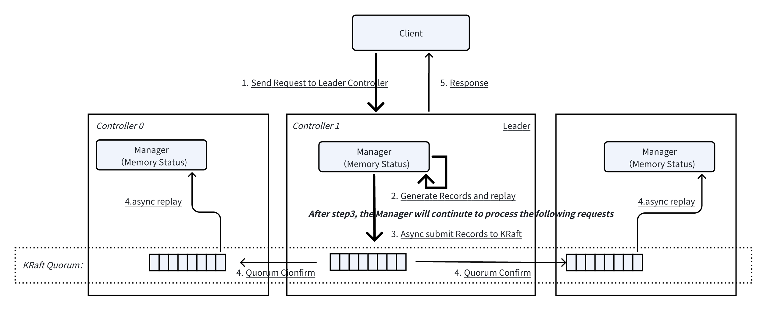 Leader 的 Manager 产生出 Records 后立刻 #replay 更新内存状态,并异步提交 Records 到 KRaft,这时候就可以继续处理下一个请求了;