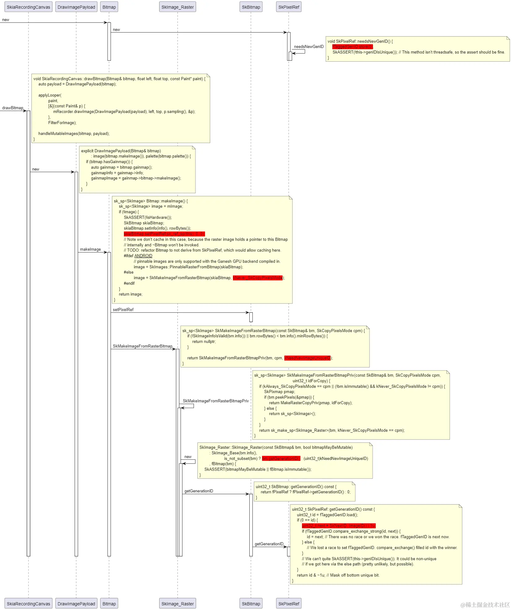 如果这个SkImage_Raster实例是由Bitmap创建的,则SkImage_Raster的fBitmap.fPixelRef指向的是创建SkImage_Raster的Bitmap,SkImage_Raster.fBitmap.fPixelRef.fUniqueID的值就是Bitmap的fUniqueID的值。Bitmap的fUniqueID的值是在Bitmap创建的时候设置的。流程如下: