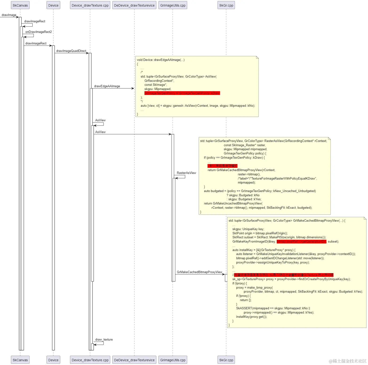 SkImage_Raster.fBitmap.fPixelRef有个成员变量fUniqueID,GrTexture有个成员变量fUniqueKey。首次绘制SkImage,创建GrTexture实例时,会根据fUniqueID来设置GrTexture的成员变量fUniqueKey,相当于建立了SkImage和GrTexture对应关系。另外,skia的内存管理模块会把创建GrTexture实例缓存起来。后续绘制同一个SkImage时,会根据fUniqueID去缓存查找GrTexture实例,没有查找到才会创建GrTexture实例。如果查找到了,就会复用。