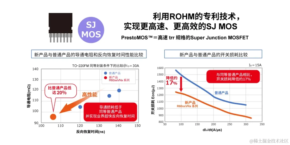另外,对于太阳能发电设施中使用的逆变电路、图腾柱PFC电路和LLC电路,建议使用融入了Super Junction MOSFET技术的PrestoMOS™。 PrestoMOS™通过采用罗姆专利技术,同时实现了业界超快反向恢复时间( trr) 和原本难以同时实现的低导通电阻,与同等的普通产品相比,更有助于逆变器节能。