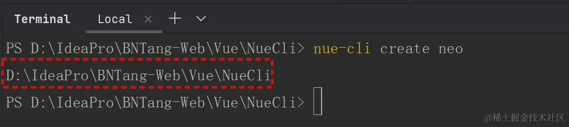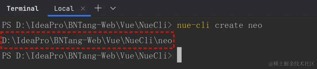 例如我现在在终端当中输入 nue-cli create neo 命令,如下图: