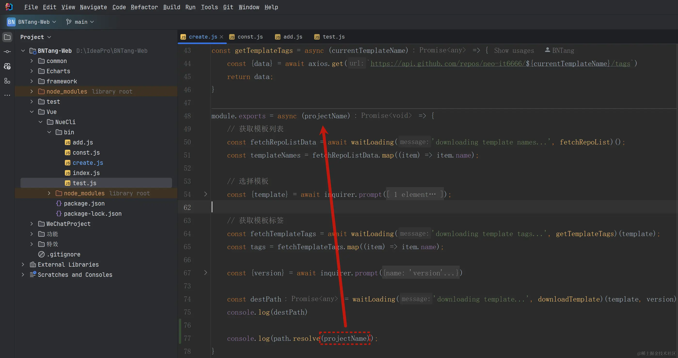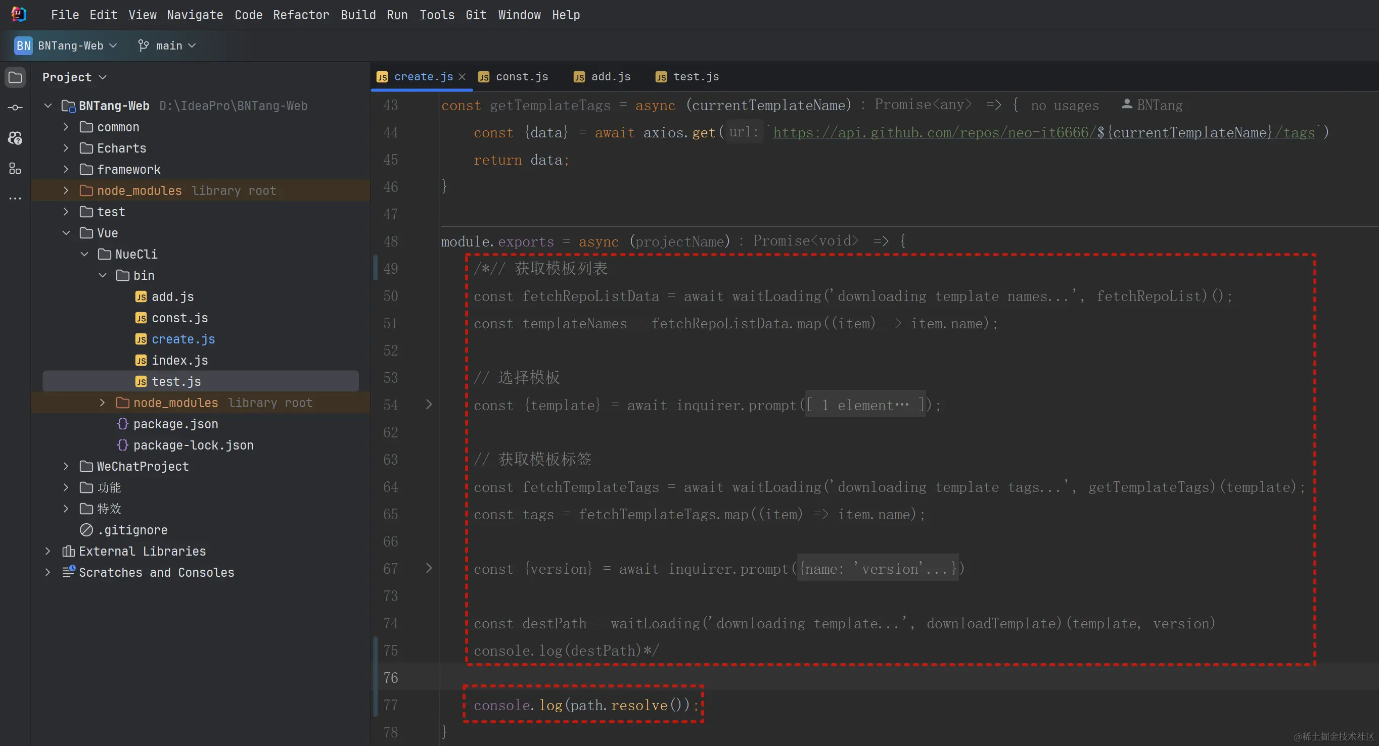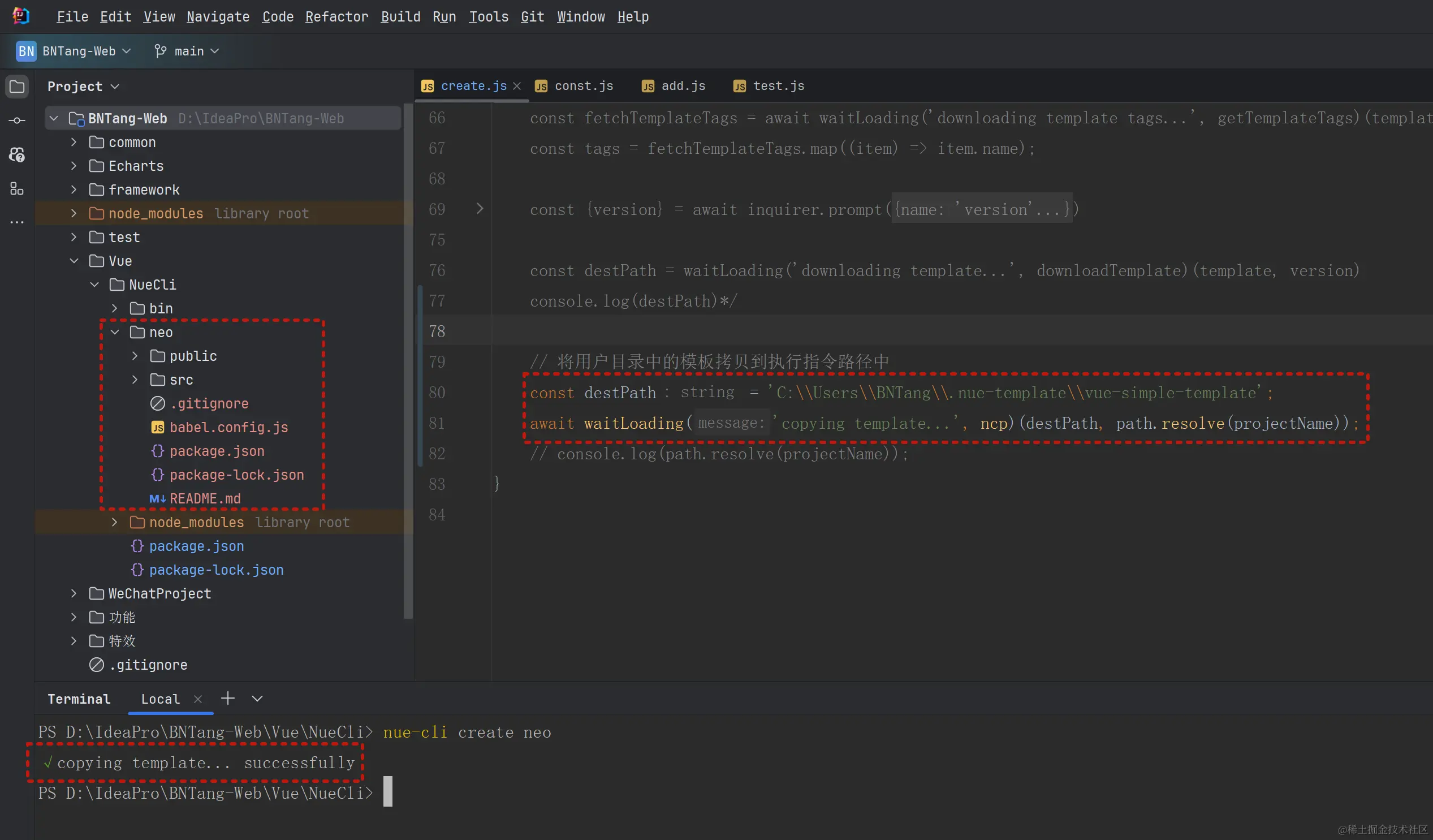 测试一下,我也是将之前的代码注释掉,目标地址我写死了,执行 nue-cli create neo 命令,看看拷贝的效果: