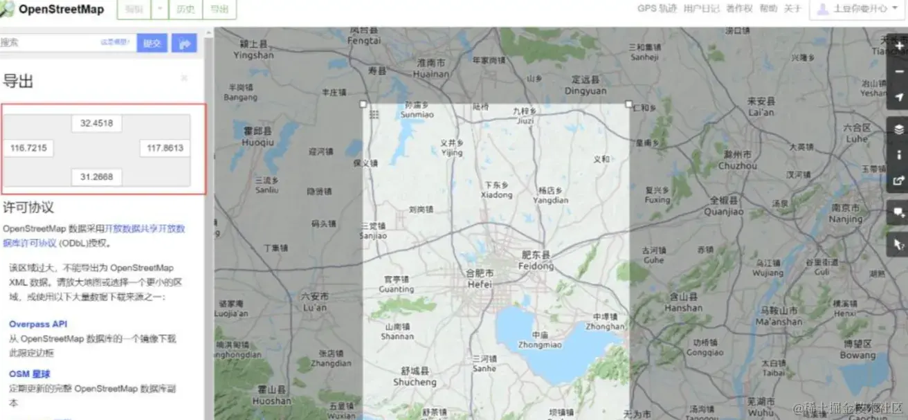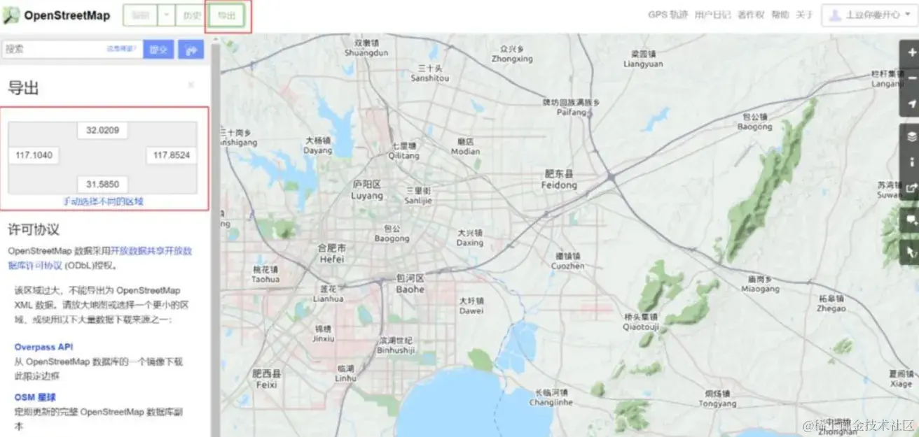 进入OpenStreetMap网站(www.openstreetmap.org),点击导出按钮,进入地图导出界面,可以看到左边出现区域选择操作区,在框中修改目标区域的四至范围,或点击下方手动选择区域,自己框选范围,然后点导出,得到osm格式数据。
