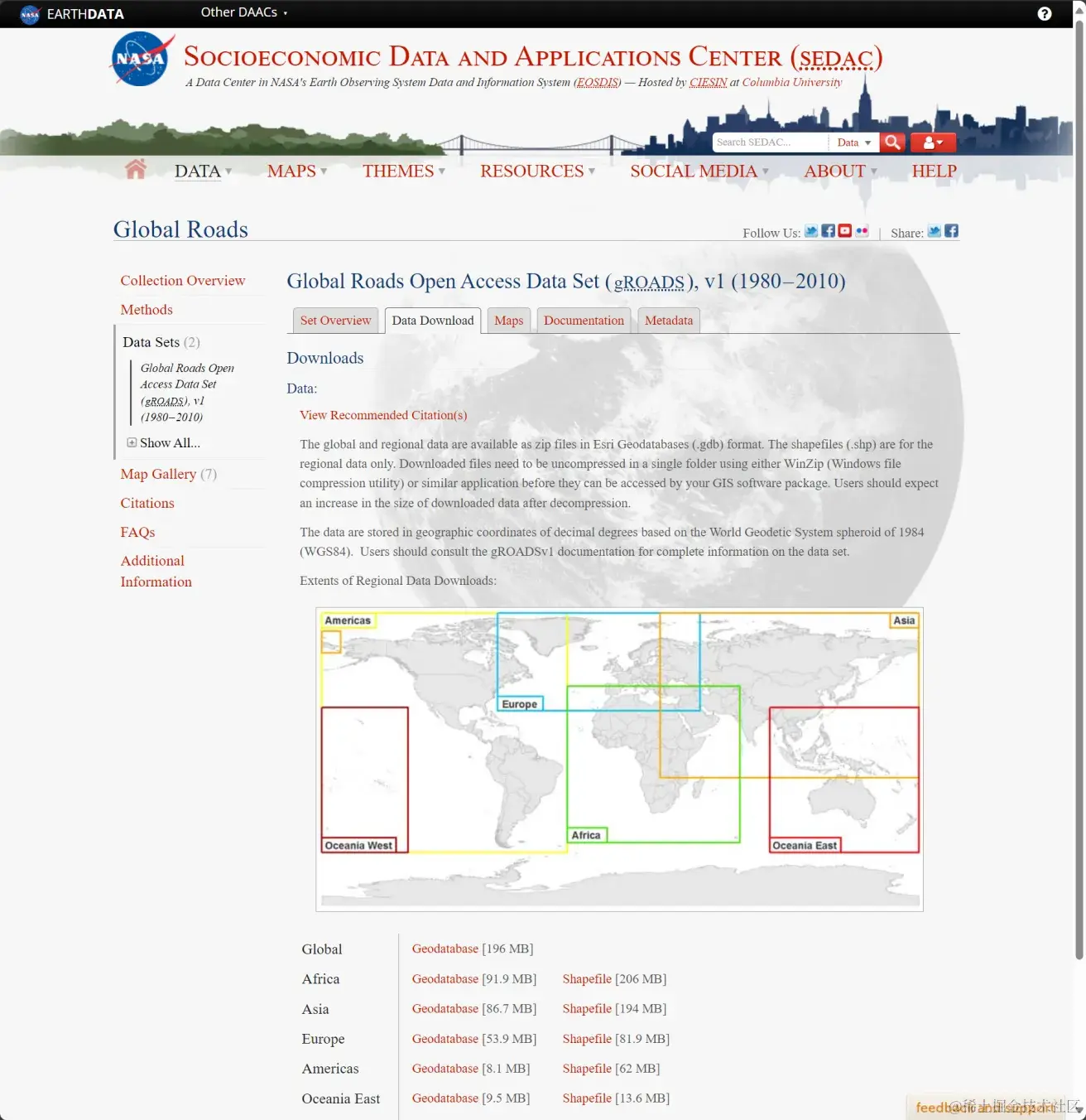 Global Roads Open Access Data Set是NASA在联合国空间数据基础设施运输通用数据基础上制作的全球道路数据集。许多国家针对该数据集进行了编辑,数据时间范围从 1980 年代到 2010 年不等,具体取决于各个国家的数据贡献和更新情况。这意味着它包含了长时间跨度的道路网络变化信息,对于研究道路网络的发展和演变非常有价值。此外该数据集的空间精度在不同国家各不相同。