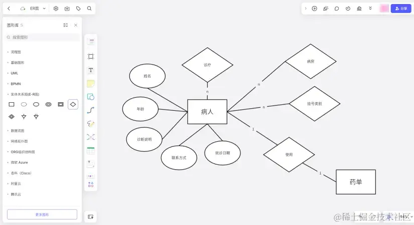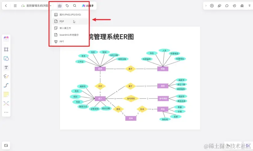 经过前面简单的几步操作,一个简单又美观的医院管理系统ER图就完成啦!ER图绘制完成后,在右上角点击「分享」可一键分享ER图;左上角点击「导出」可立即导出PNG/JPG图片、SVG、PDF等格式文件至本地进行保存。