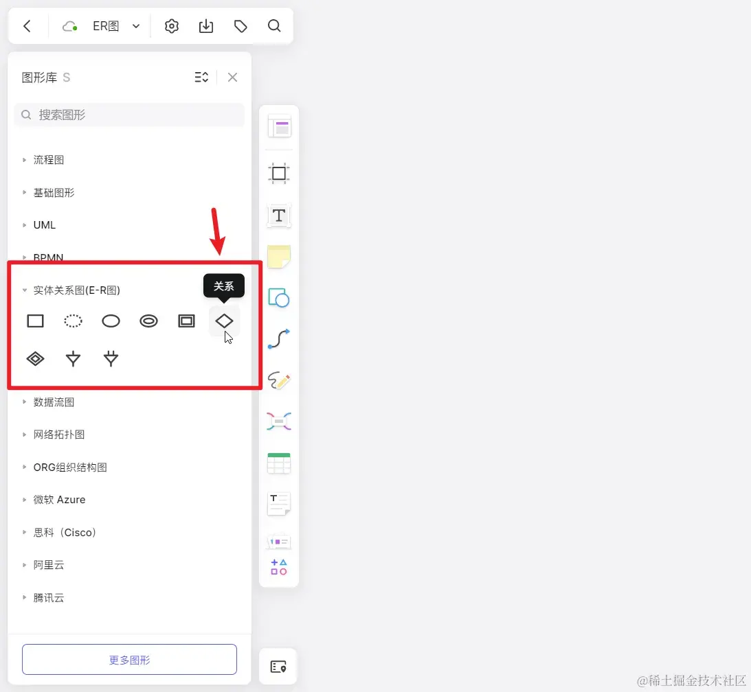 新建白板文件后会自动进入白板的编辑界面,如下图所示,点击 boardmix白板左侧菜单栏的「图形」工具,打开左侧的「图形库」面板,在图形库面板可以看到绘制ER图(实体关系图) 的图形符号。
