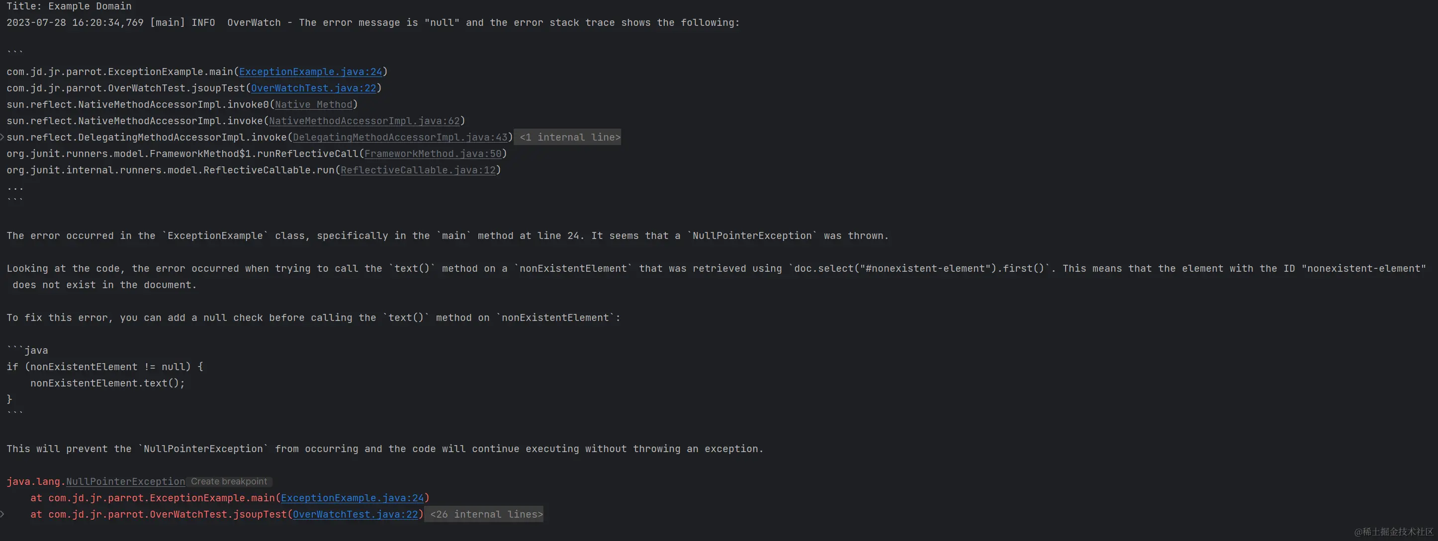 📎importorg.jsoup.Jsoup;importorg.jsoup.nodes.Document;importorg.jsoup.nodes.Element;importorg.jsoup.select.Elements;importjava.io.IOException;publicclassExceptionExample{ publicstaticvoidmain(String[]args){ try{ // 使用Jsoup抓取网页内容 Documentdoc=Jsoup.connect("https://www.example.com").get(); // 解析网页内容 Elementtitle=doc.select("title").first(); System.out.println("Title: "+title.text()); // 尝试获取一个不存在的元素 ElementnonExistentElement=doc.select("#nonexistent-element").first(); // 在非空元素上调用方法,会抛出NullPointerException nonExistentElement.text(); }catch(IOExceptione){ e.printStackTrace(); } }}