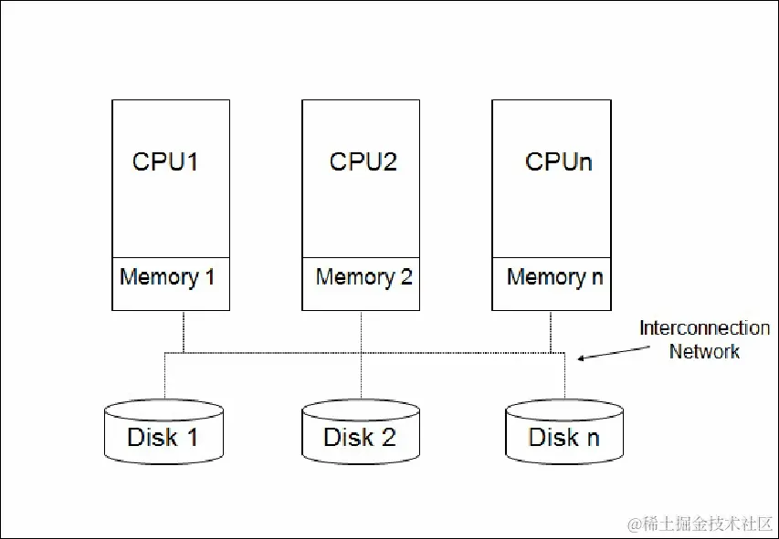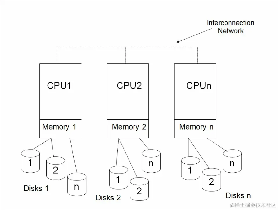 另一方面,我们有共享磁盘架构。在这种架构中,所有节点(CPU)共享对所有可用数据库服务器的访问权限,从而可以访问系统的所有数据。与共享无架构不同,互连网络层位于 CPU 和数据库服务器之间,允许多个数据库服务器访问。值得注意的是,与共享无架构相比,共享磁盘集群在可扩展性方面并不能提供太多优势,因为如果所有节点共享访问同一数据,则需要一个控制节点来监控系统中的数据流。问题在于,在从属节点数量超过一定限度后,主节点将无法有效地监控和控制所有从属节点。
