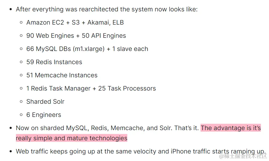 - 成熟时期:这个阶段涉及有意识地简化他们的架构,专注于成熟、可扩展的技术,如 MySQL、Memcache 和 Redis。Pinterest 没有增加技术栈,而是把资金投入到令其运转良好的领域。