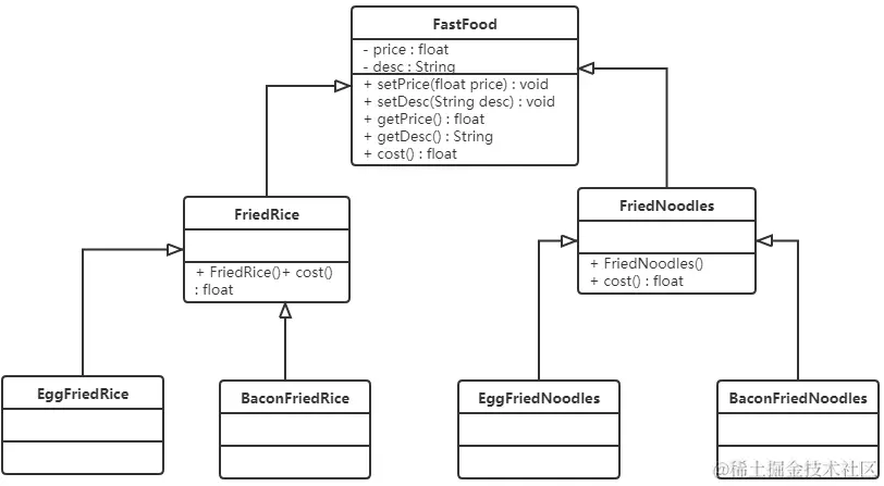 如果要再加一种配料(火腿肠),我们就会发现需要给FriedRice和FriedNoodles分别定义一个子类。如果要新增一个快餐品类(炒河粉)的话,就需要定义更多的子类。
