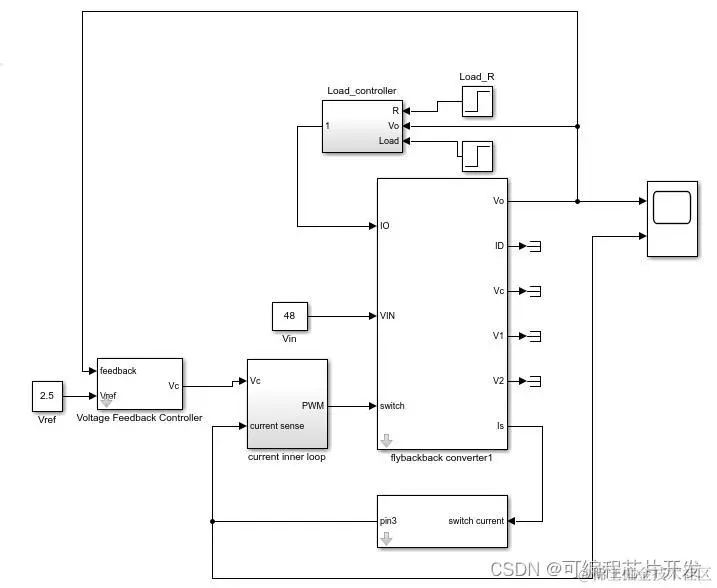 flyback反激型电路建模与仿真。反激变换器在开关管导通时电源将电能转为磁能储存在变压器中,当开关管关断时,再将磁能变为电能传送到负载。单端反激变换器是由Buck-Boost变换器派生而来。