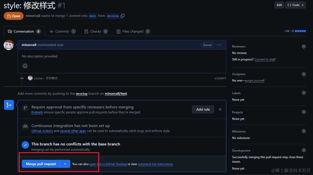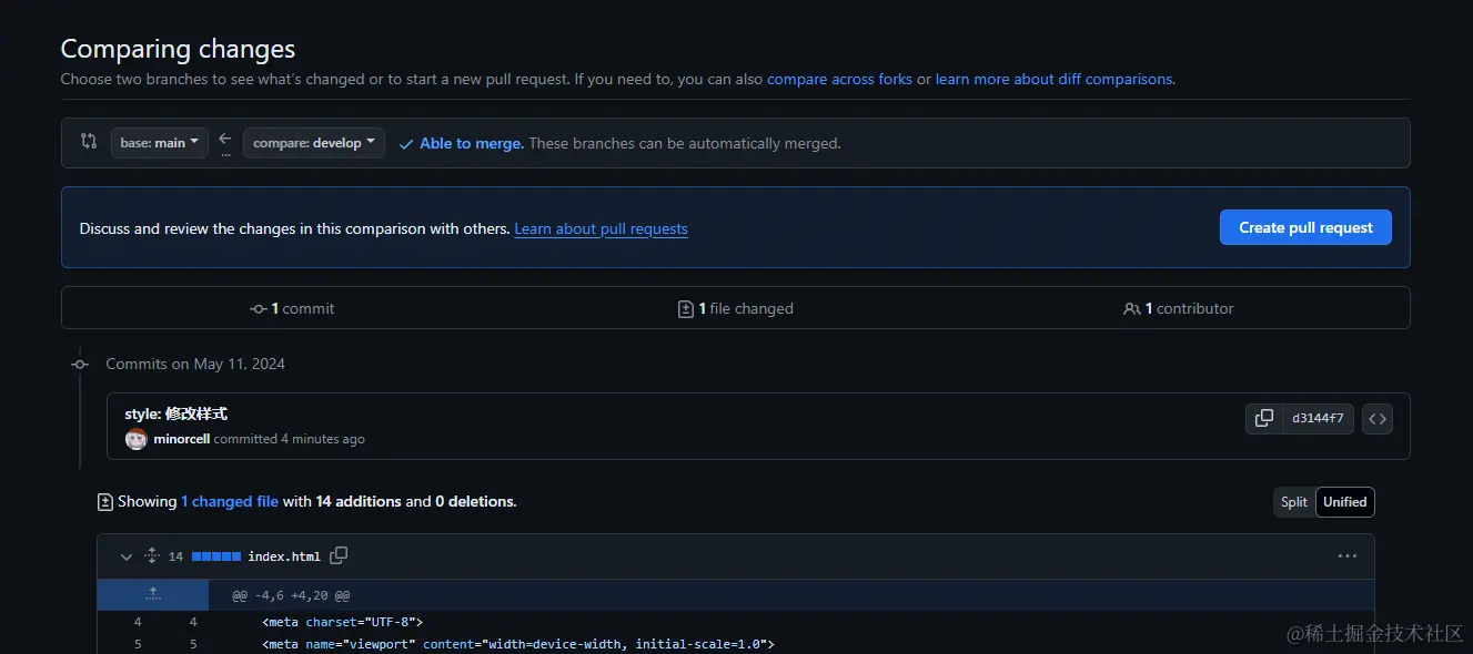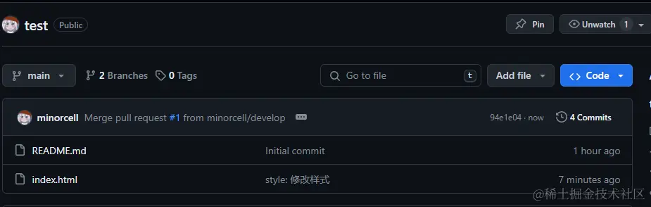 - 完成合并,可到code选项查看,此时main分支已经更新和deve;op分支一样内容。