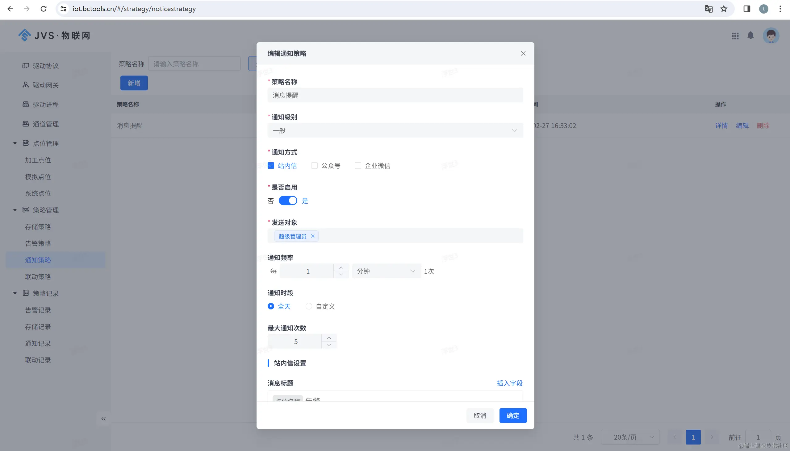 在企业和组织的日常运营中,及时、准确的告警通知至关重要。JVS物联网提供了一个灵活且可配置的通知策略,通知策略提供多样化的通知方式,还允许用户根据自身需求进行详尽的配置。从通知方式的选择到通知内容的定制,再到通知渠道的管理,本策略都提供了细致入微的设置选项,以满足不同场景下的告警通知需求。通过这一策略,我们可以大大提高告警信息传递的效率和准确性,从而保障企业或组织的安全与稳定。