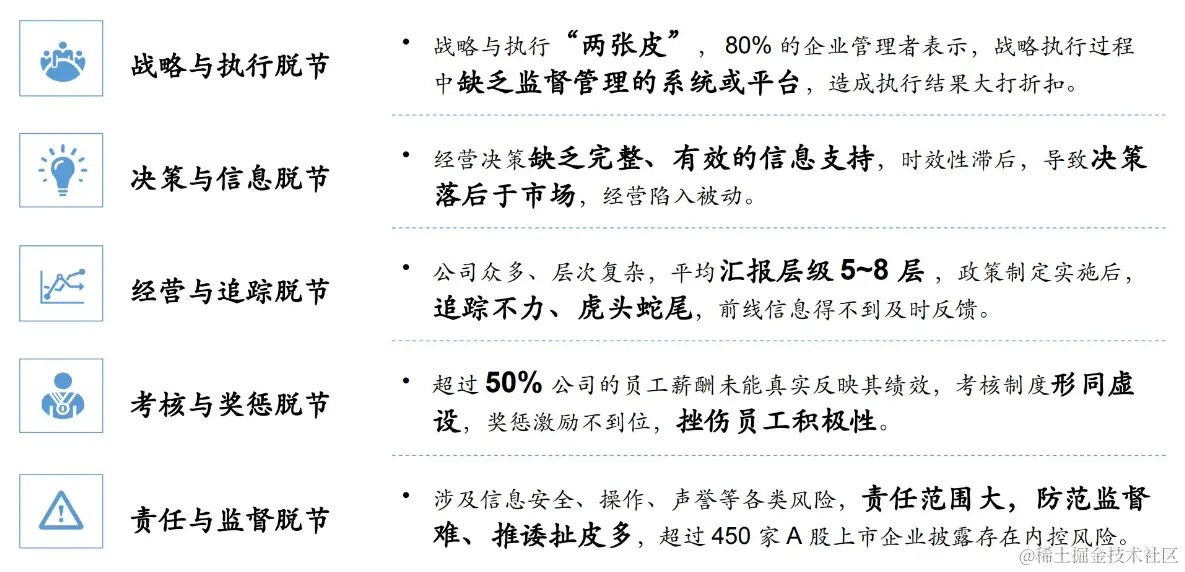 1、战略与执行脱节:战略与执行“两张皮”,80%的企业管理者表示,战略执行过程中缺乏监督管理的系统或平台,造成执行结果大打折扣。