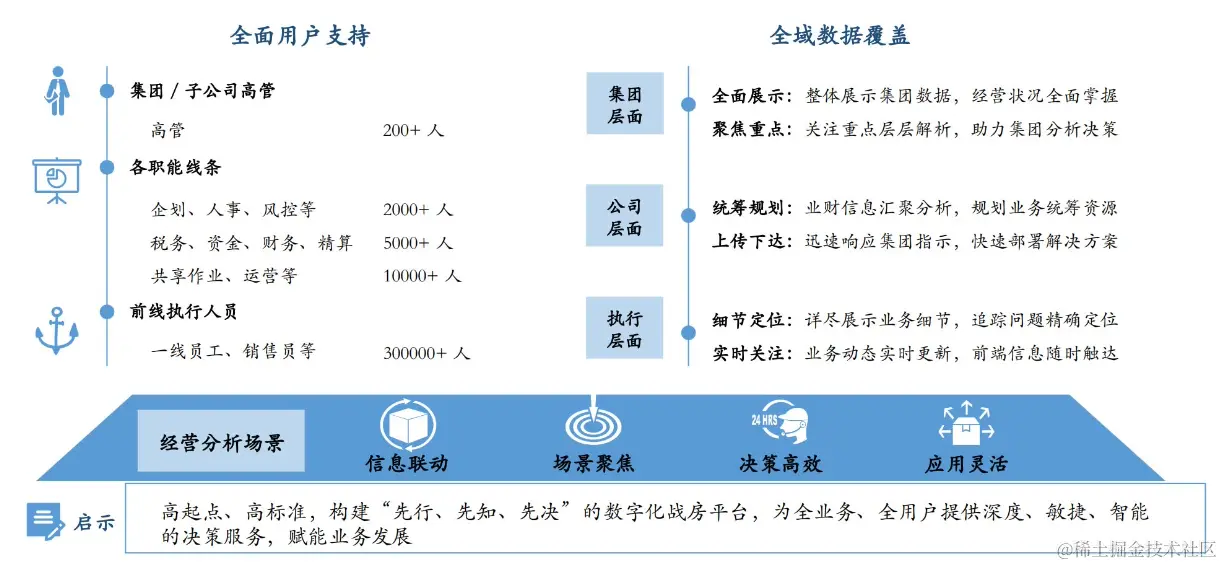 以全域大数据建设为中心,覆盖全集团数据从采集、归集、加工、服务、消费的全链路的各个环节,面向各管理层级、各专业部门提供即时、准确、完整的数据服务,促进数据融合共享,实时响应业务需求。