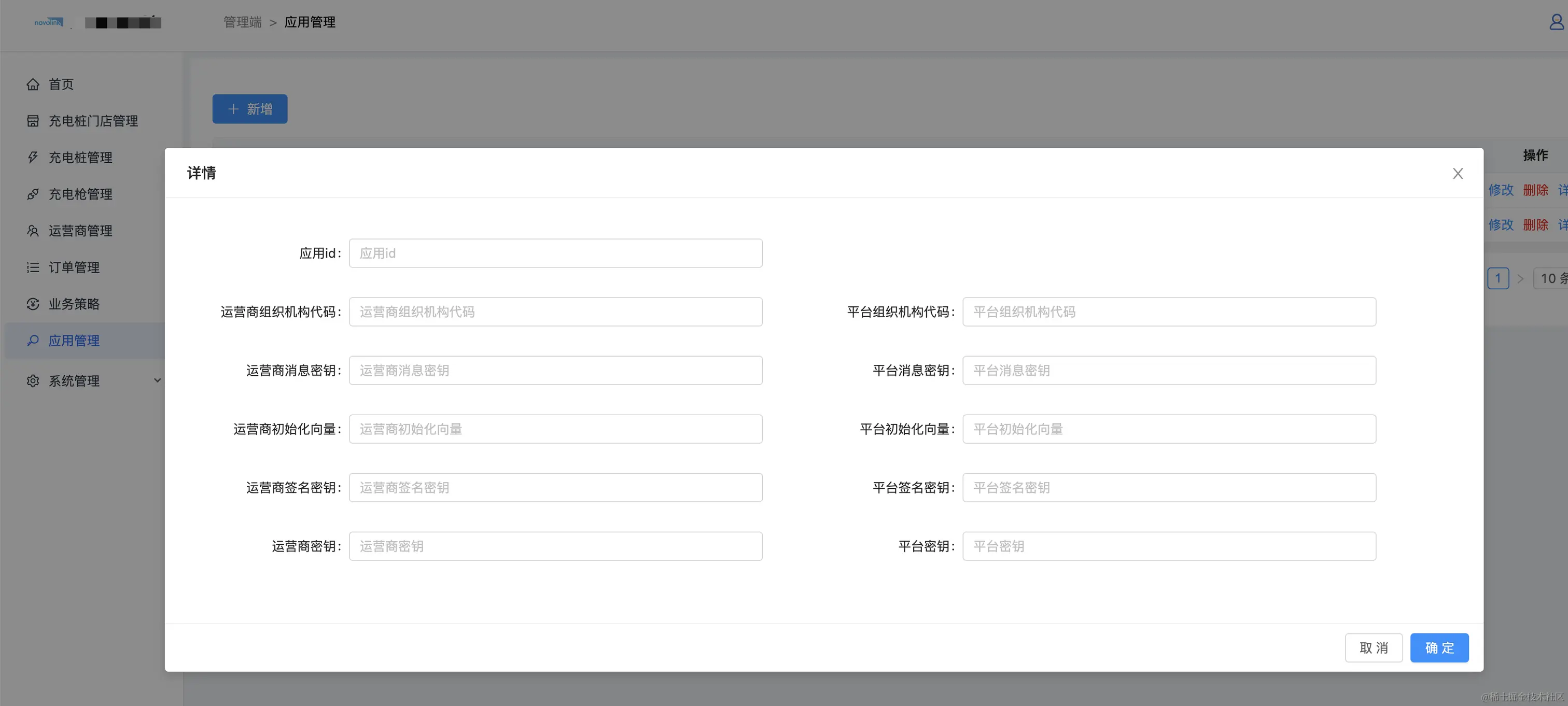 运营商可以在这个模块创建应用,生成密钥,用于开放平台接入。可以实现查询充电站、充电桩、启动充电、停止充电、订单同步、对账等接口服务能力。