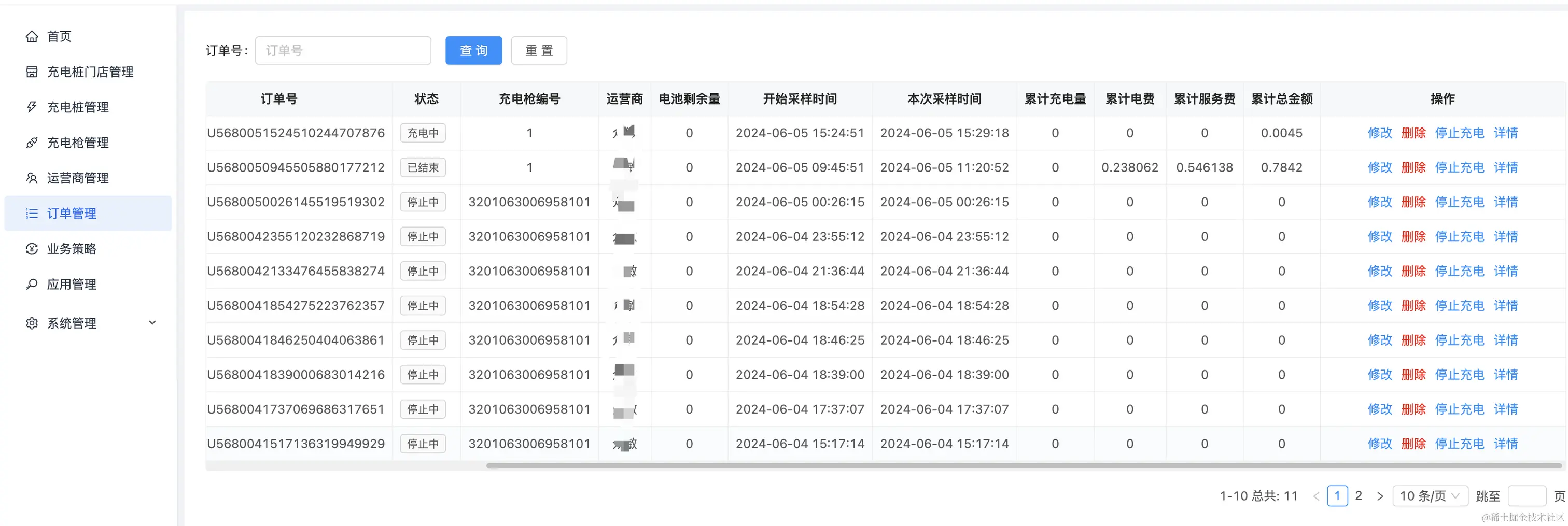 订单管理则是平台内所有订单的归集,包括平台自身发起的订单和合作方通过开放平台发起的充电订单,充电中的订单以10s的频率将订单信息(充电电量、费用信息)同步给合作方,订单结束后也会将订单的充电电量、电费、服务费、总费用等信息等同步给合作方,每天凌晨2点的时候,将合作方发起的订单的账务信息,打包发送给合作方,进行对账。