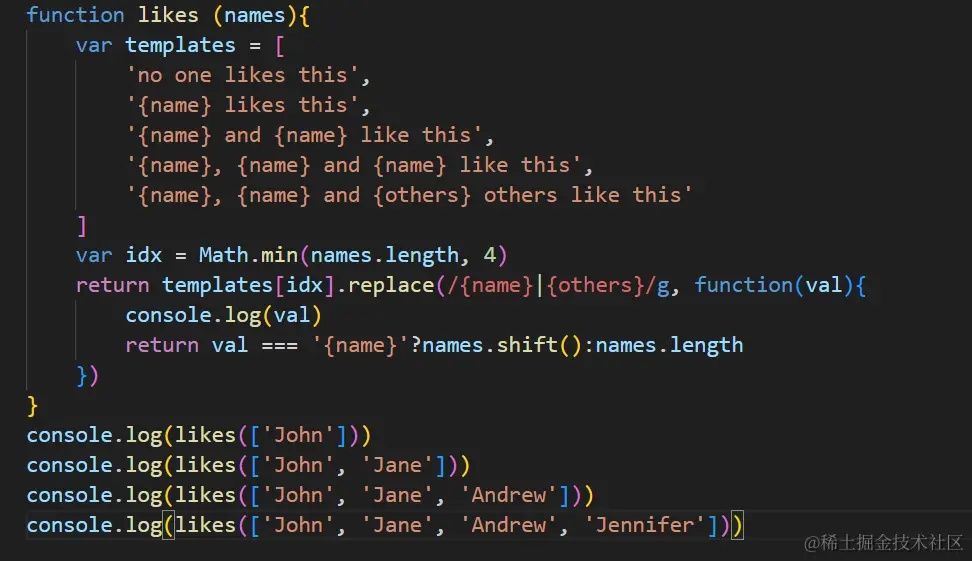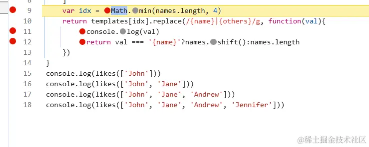 分别在9、11、12三个位置打上了断点,运行console.log(likes(['John']))时获取的idx为1,即使用模板一,通过正则表达式/{name}|{others}/g去匹配对应的数据,其中|代表或者,代表全局替换