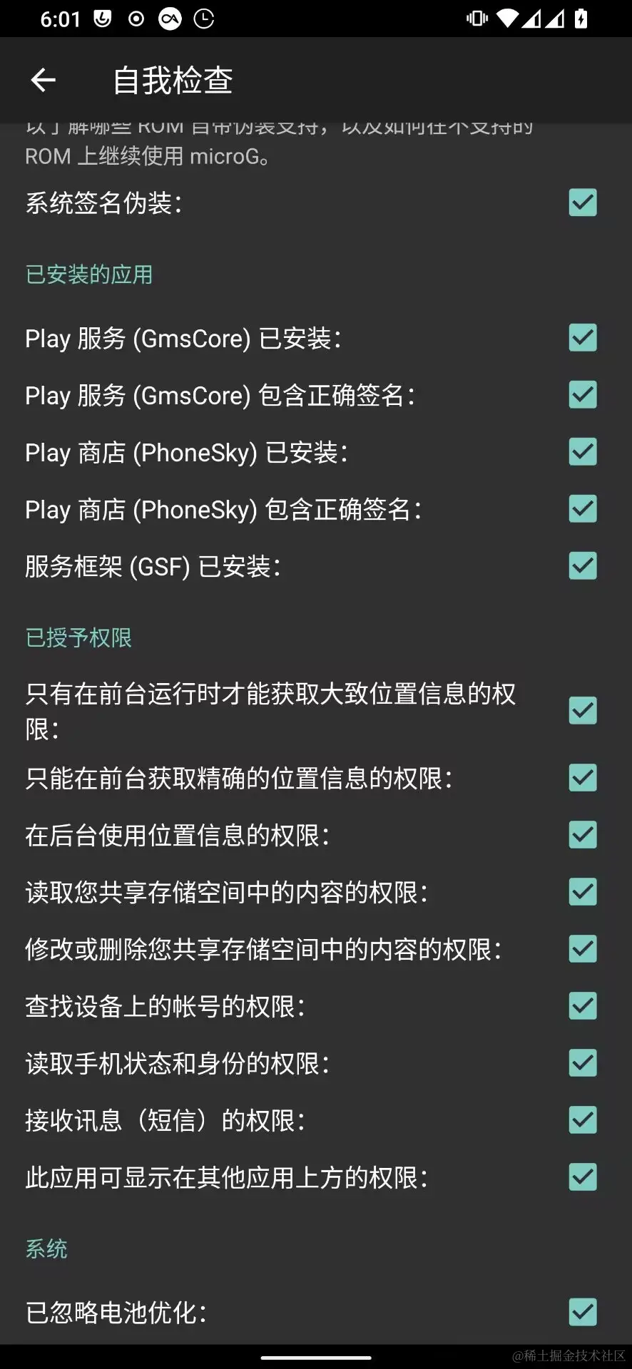 下载安装,然后在lsposed启用勾选系统框架,重启就会看到microg设置的自我检查->签名伪装支持生效了,然后把其他未勾选的权限勾选上就可以,这个时候打开microg的自我检查应该全部都勾选了