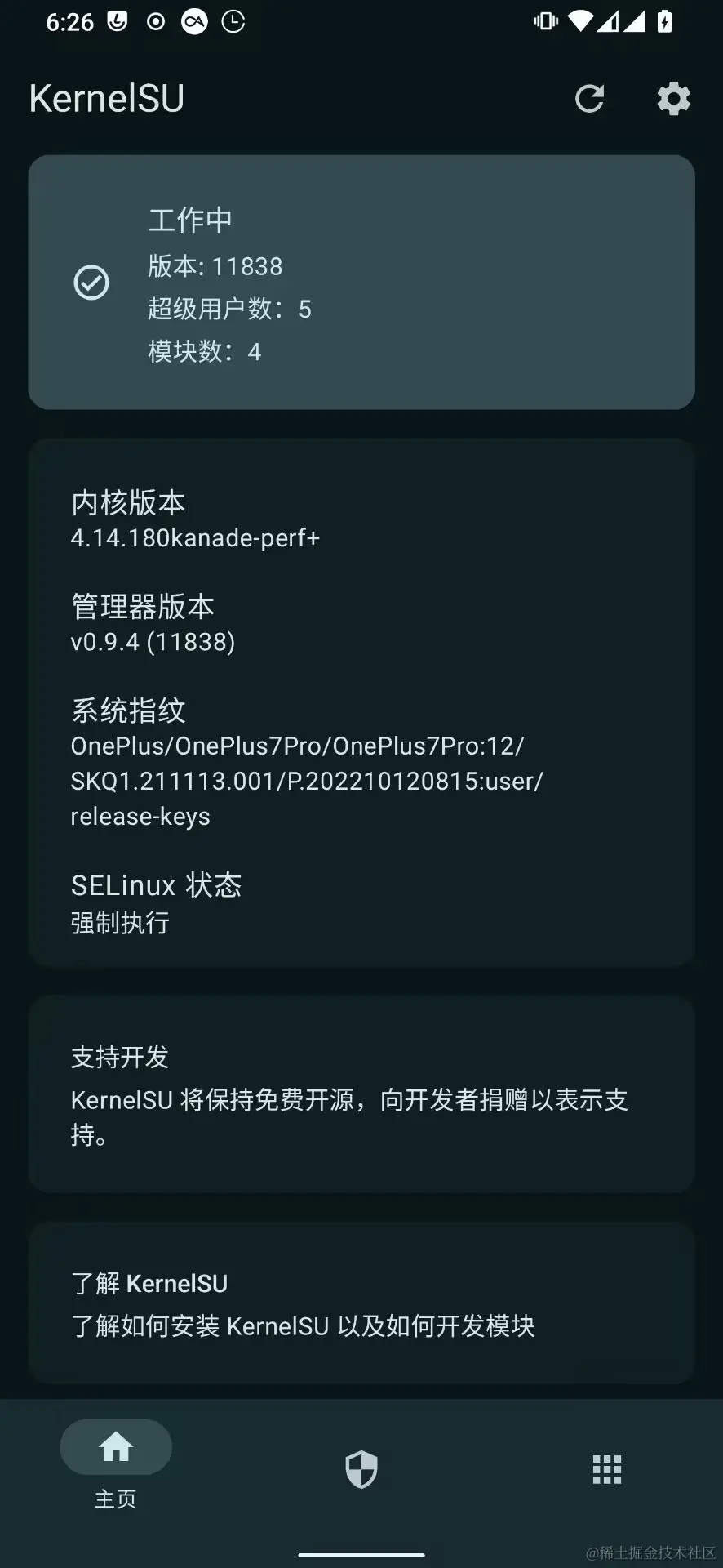 降级到Lineageos20没出现没声音和无法接打电话的情况,那就是Lineageos21和kernelsu不兼容的问题了。不过在Lineageos20刚开始打开kernelsu管理器看没生效,当我第二天打算继续降级到Lineageos19.1的时候,打开管理器一看又生效了,也是奇怪,重启又没了。