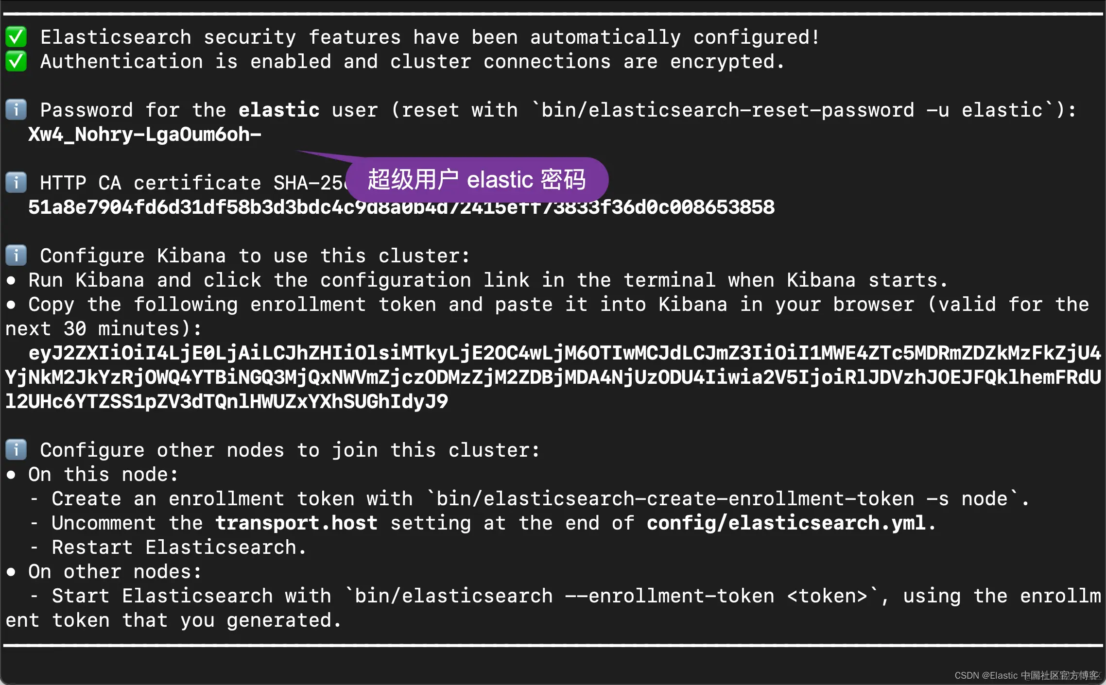 我们需要记下 Elasticsearch 超级用户 elastic 的密码。我们可以在它的安装目录中找到相应的 Elasticsearch 证书: