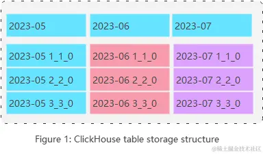 表中的数据首先按照分区键被划分为多个分区,分区键常采用日期的方式,比如下图中按照月份分区。每次数据批量插入形成一个最小的存储单元,ClickHouse中称为Part,Part归属于某一个分区。