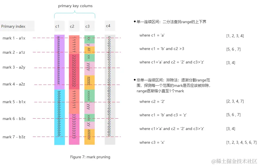 ClickHouse索引过滤的最小粒度就是Mark。下图展示了c1,c2,c3三个列组成主键的一个Part的数据结构以及Mark过滤的流程。