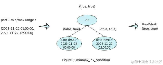 Part裁剪的目的是一次性过滤整个Part文件,只保留可能包含目标数据的Part。ClickHouse中的Part裁剪过程中会构建两个KeyCondition。其中一个被称为,主要用于根据分区列的最大值和最小值进行Part过滤。minmax_idx_condition的keys为构成分区键对应的原始列,比如分区键为toDate(date_time),那么它的key为date_time列,后续进行过滤的时候传入的也是date_time对应的值组成的范围矩阵。下图展示了minmax_idx_condition的工作原理。